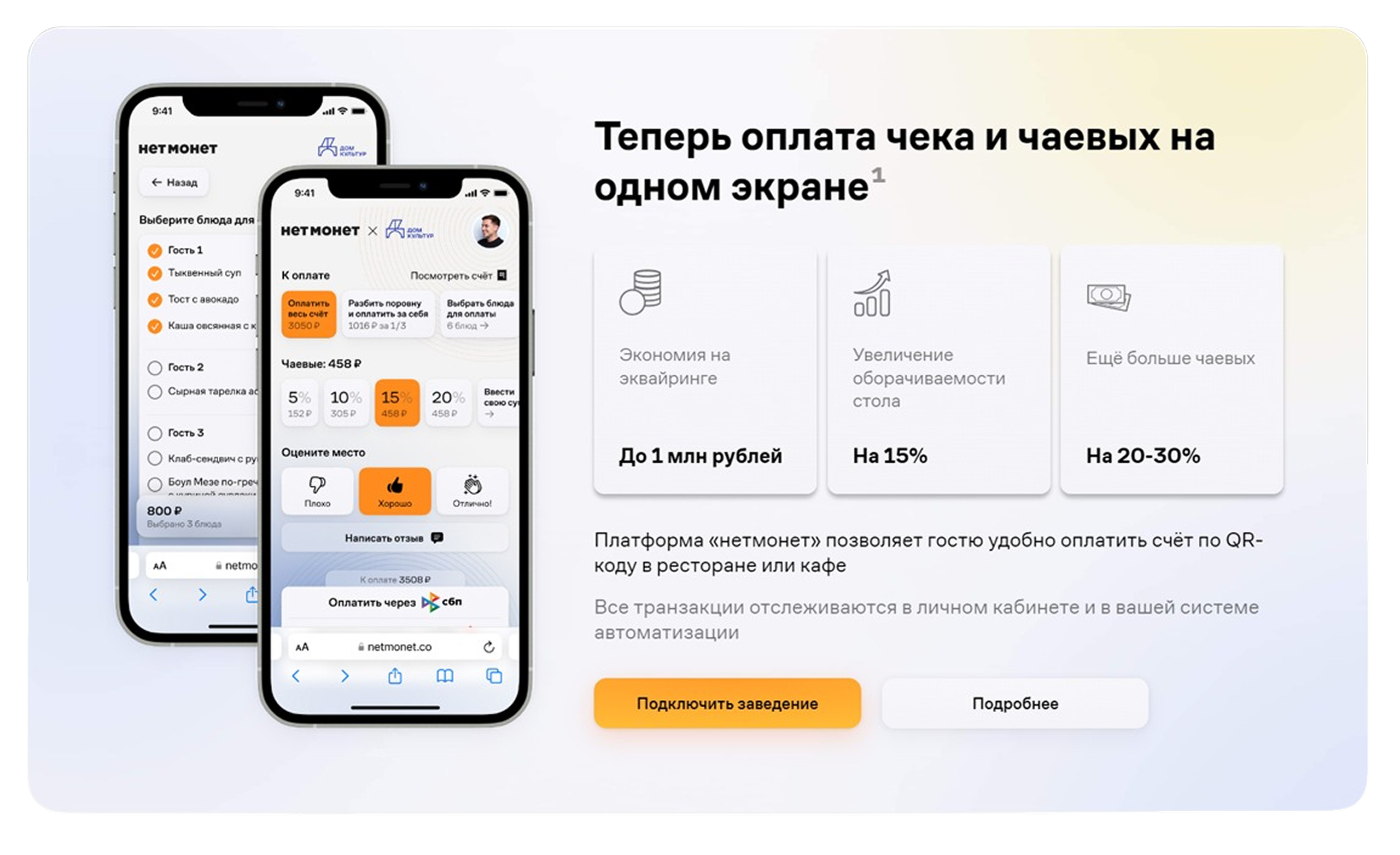 «Нетмонет» — это сервис Альфа-Банка, который позволяет ресторанам, кафе и другим заведения из сферы общепита принимать чаевые по банковской карте через QR-код. По данным сервиса, оплата по безналу позволяет официантам получать на 30% больше чаевых.