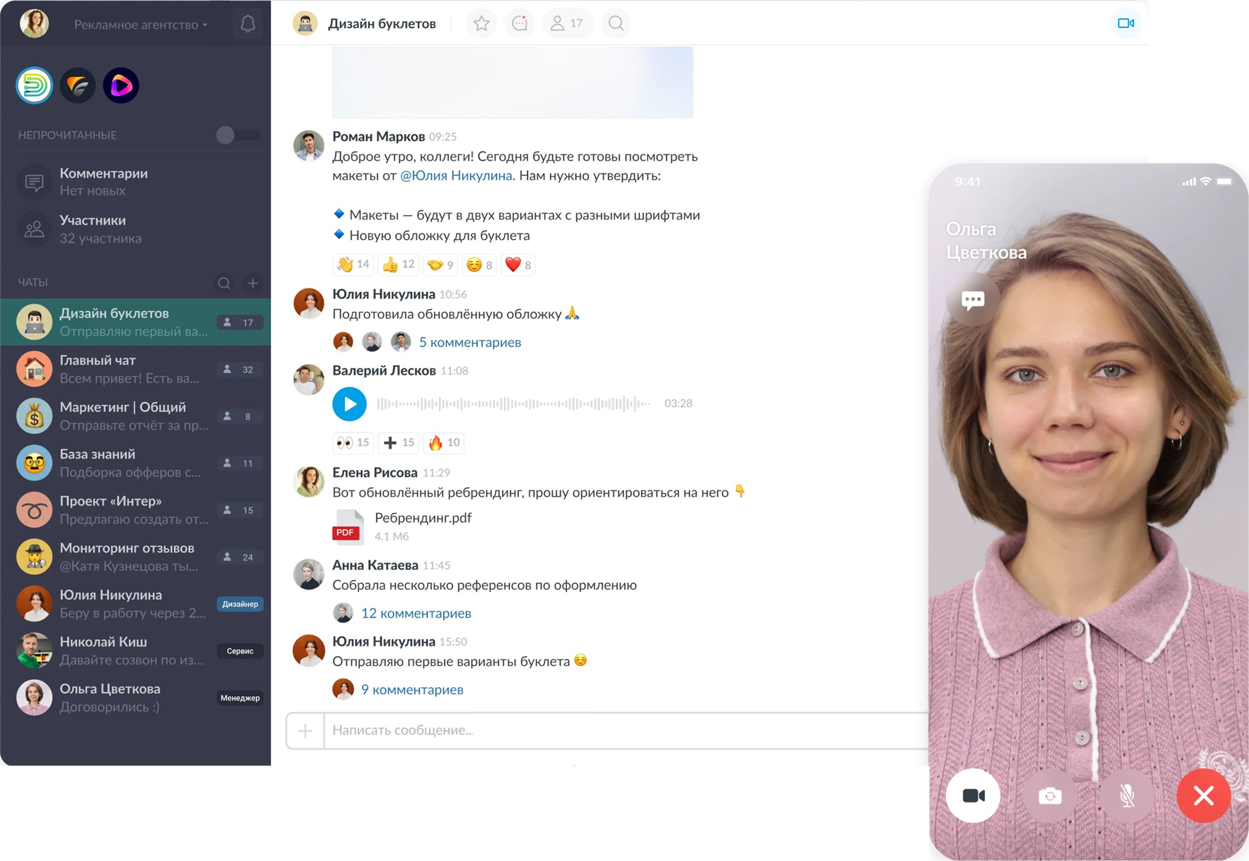 - Создавать закрытые и открытые каналы и чаты для проектов, отделов или задач.Можно тегать коллег, искать сообщения по истории и ставить на них реакции, обмениваться файлами, сохранять черновики и закреплять приоритетные папки и чаты на рабочей панели.