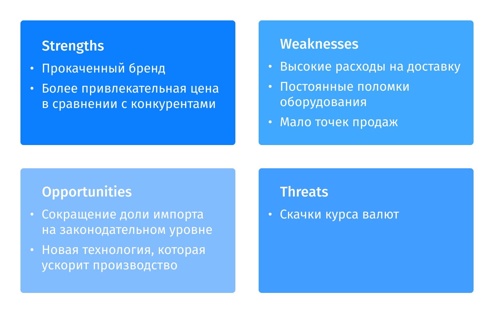- Opportunities — возможности для развития компании, которые не влияют на бизнес, но могут помочь вырасти.